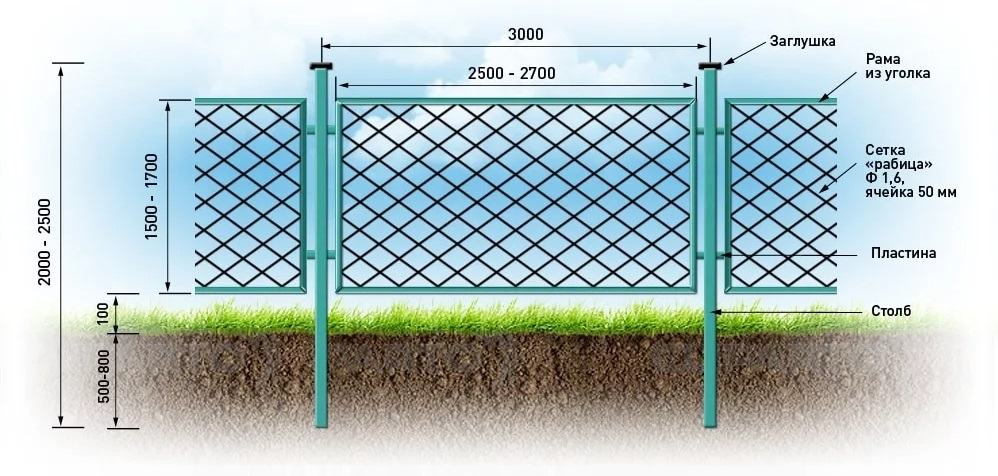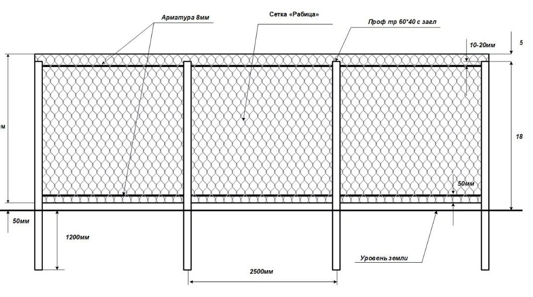 • Конструкция забора из сетки-рабицы с протяжкой арматурой